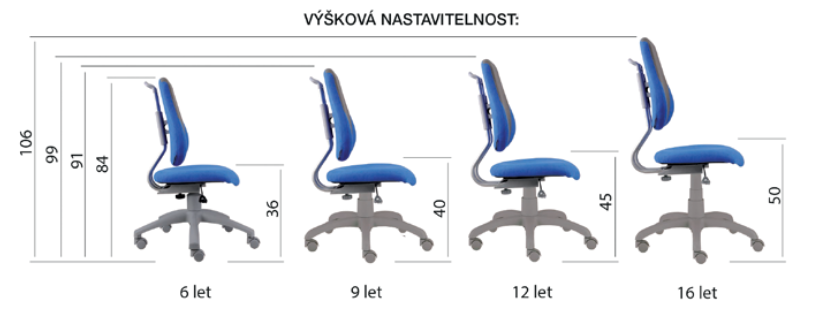 - Roste s dítětem 4–18 let: sedák, opěradlo i výška se přizpůsobí aktuální výšce i proporcím dítěte.