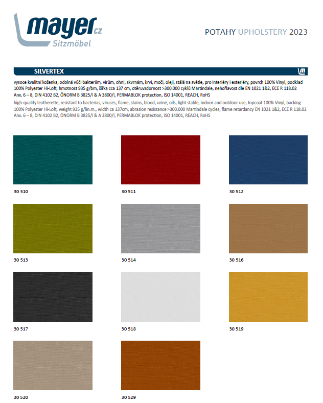 Židle Mayer často využívají materiály určené pro zdravotnické provozy (speciální vinyly a „MED“ potahy), které snesou časté dezinfekce a rychlé čištění bez ztráty vzhledu a funkce.