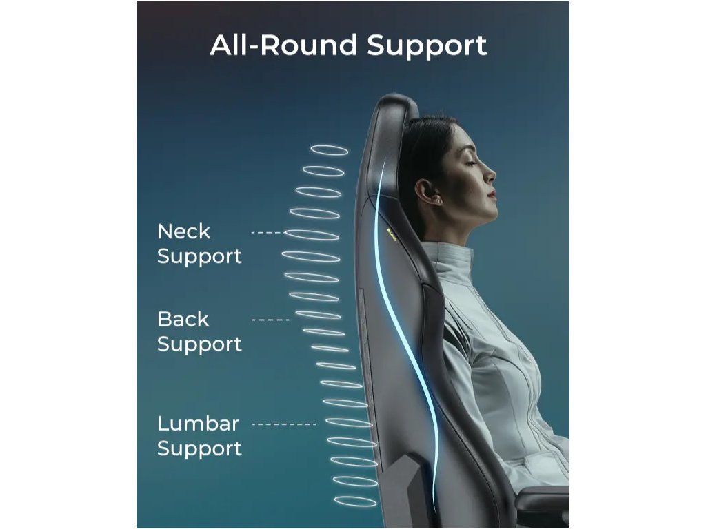 - Ergonomie bez kompromisu – integrovaná bederní opěra s plynulým hloubkovým nastavením a magnetický podhlavník z paměťové pěny pro uvolnění šíje.