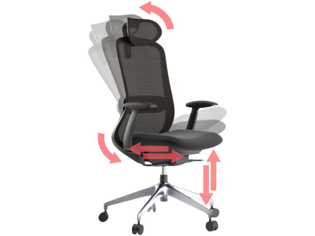 - Synchronní mechanika: Sedák a opěrák se naklápějí v koordinaci tak, aby kopírovaly váš přirozený pohyb. Ulevuje zádovým svalům, podporuje cirkulaci a brání ztuhnutí. Záklon lze aretovat ve 4 polohách – snadno tak střídáte aktivní a relaxační pozici.