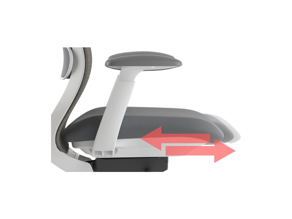 - Posuv sedáku (hloubka sezení): Zvětšuje či zmenšuje sedací plochu podle délky stehen. Skvělé, když se na židli střídá více lidí, nebo potřebujete o pár centimetrů víc prostoru pro komfort kolen.