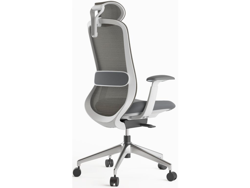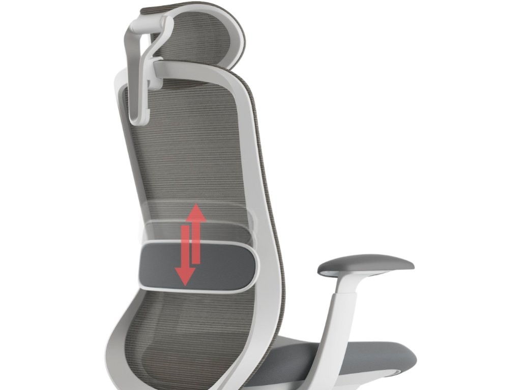 - Bederní opěrka: Výškově nastavitelná opora umožní jemné „vyklenutí“ v bedrech, abyste seděli přirozeně vzpřímeně – bez hrbení a únavy.