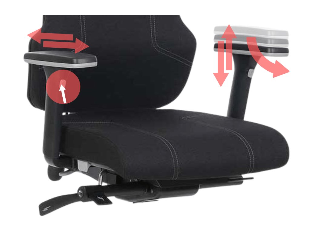 - 3D područky: výška, hloubka (dopředu/dozadu) a stranově do boku. Měkčená dotyková plocha (PU/TPU) šetří lokty a ramena.
