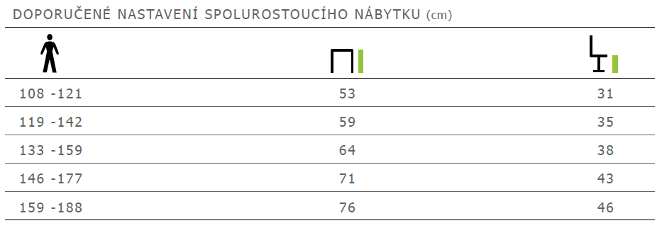 - Mechanika: rostoucí (bezestupňové nastavení výšky a hloubky sezení)