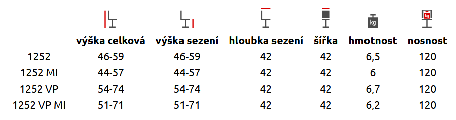 - Nastavení: výška sezení (dle zvolené mechaniky a pístu, včetně varianty RI – kruhový ovladač)
