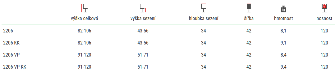 - Celková výška: 82–106 cm (standard) / 91–120 cm (VP)