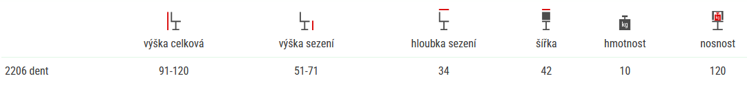 - Mechanika: ocelová, s plynulým nastavením výšky; bezestupňová aretace výšky a sklonu opěrky.