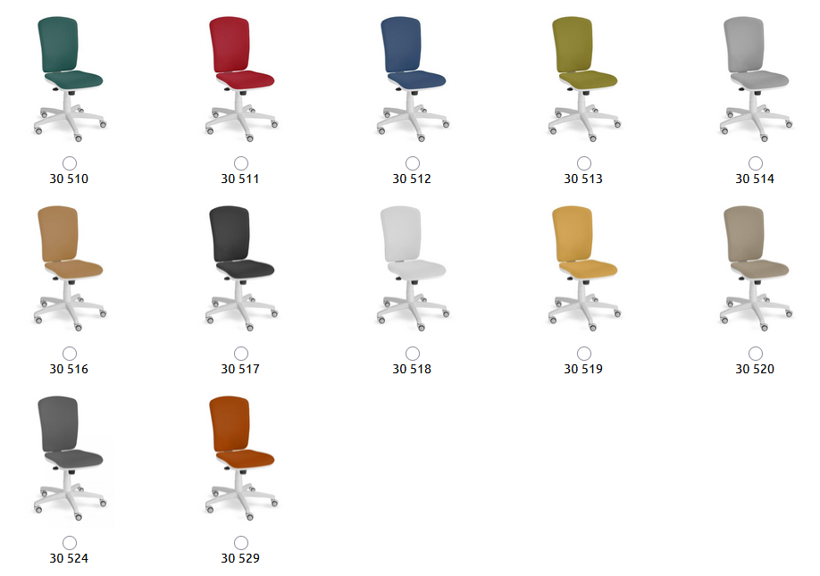- Základní výbava: měkká kolečka na tvrdé podlahy (světle šedá RAL 7035), průměr 50 mm, s automatickou bezpečnostní brzdou v nezatíženém stavu – stolička „neujíždí“, když si na ni sedáte.