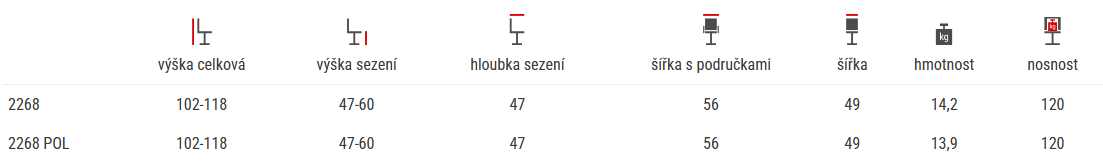 - Opěrka zad: výška 54 cm, šířka 42 cm; rastrově výškově nastavitelná (horní hrana 52–56 cm nad sedákem), nastavitelný sklon; PUR pěna 3 cm